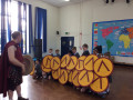 Year 4 have been very fortunate because they spent a whole day learning about Ancient Greece. Their favourite part was re-enacting a battle, they learned how to protect themselves with a shield and how to strike with a spear. They were practising writing on papyrus using ink, so they could become a Greek scribe, they used the Greek alphabet to help with sounds. They learned how to play Greek games, they listened to stories and they learned about the Greek gods and goddesses. We had a lovely day. Our visitor from Ancient Greece, was very impressed with the children’s listening, learning and behaviour.